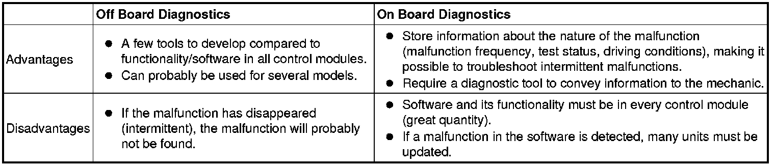 Troubleshooting or diagnostics are performed by the mechanic using two different concepts; Off Board Diagnostics (diagnostics outside the vehicle) or On Board Diagnostics (diagnostics system in the vehicle).