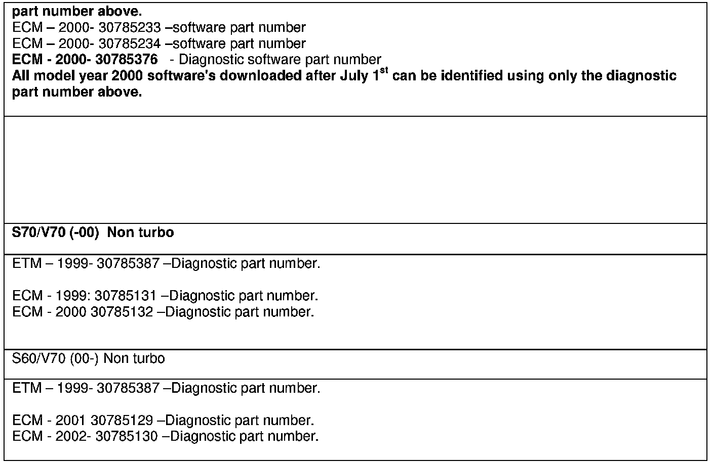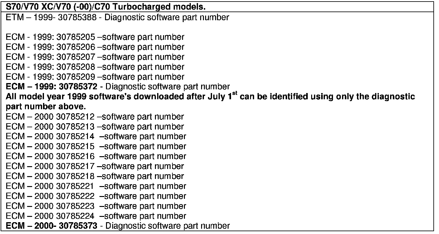 In VIDA 2006B, guidance is given to identify the latest ETS software as a part of most of the fault tracing steps. However, due to the long lead times involved in publishing the VIDA information, the part numbers used for the turbo and 6-cylinder non-turbo vehicles are incorrect. (See below.)