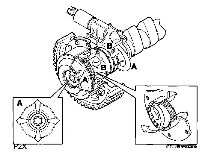 The Continuous Variable Valve Timing unit is mounted on the exhaust camshaft and is installed on all B52X4T engines. The control has 15 camshaft degrees (30 crankshaft degrees) between its outer positions.