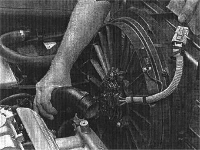 Press the charge air pipe backward and lift up the engine cooling fan (FC) with its cover.