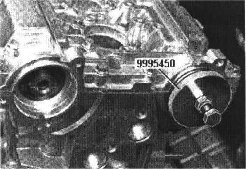 Install camshaft adjustment tool 999 5452 at the rear edge of the camshafts.