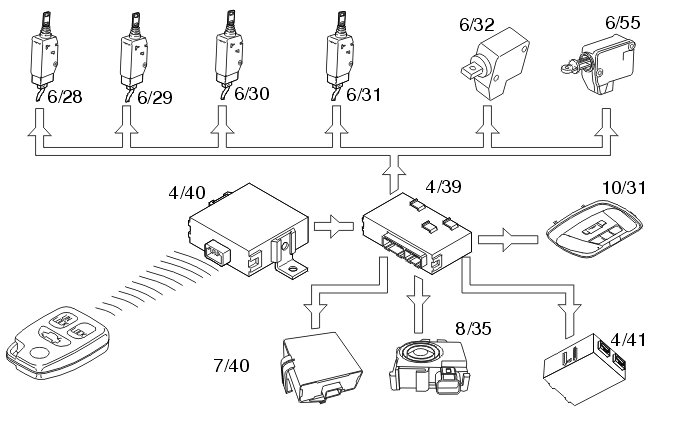 When the system receives the "LOCK" signal from the remote control or the key is turned towards the "LOCKED" position, the doors are locked and the system switches to wait state. During the following 25 seconds, the system monitors whether the driver's door is opened. If this happens, the alarm is disarmed and the doors are unlocked. The locking sequence can be cancelled with the key, remote control or by other action.