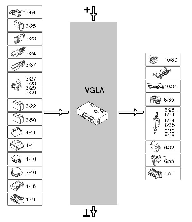 The table below summarizes the input signals to and output signals from the VGLA control module. The illustration below displays the same information with the Volvo component designations.
