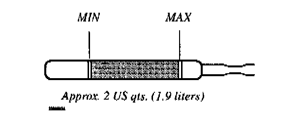 Park the car on a level surface and wait for at least 3 minutes after the engine has been switched off. Be sure the oil level is maintained between the upper and lower marks on the dipstick. If oil is added, it should reach the MAX mark on the dipstick. Low oil level can cause internal damage to the engine and overfilling can result in high oil consumption. The distance between the dipstick marks represents approx. 2 US qts (1.9 liters). The oil should preferably be checked when cold, before the engine has been started.