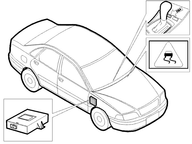 Control module (right-hand drive cars: at the left A-post), DSA warning lamp and DSA switch.