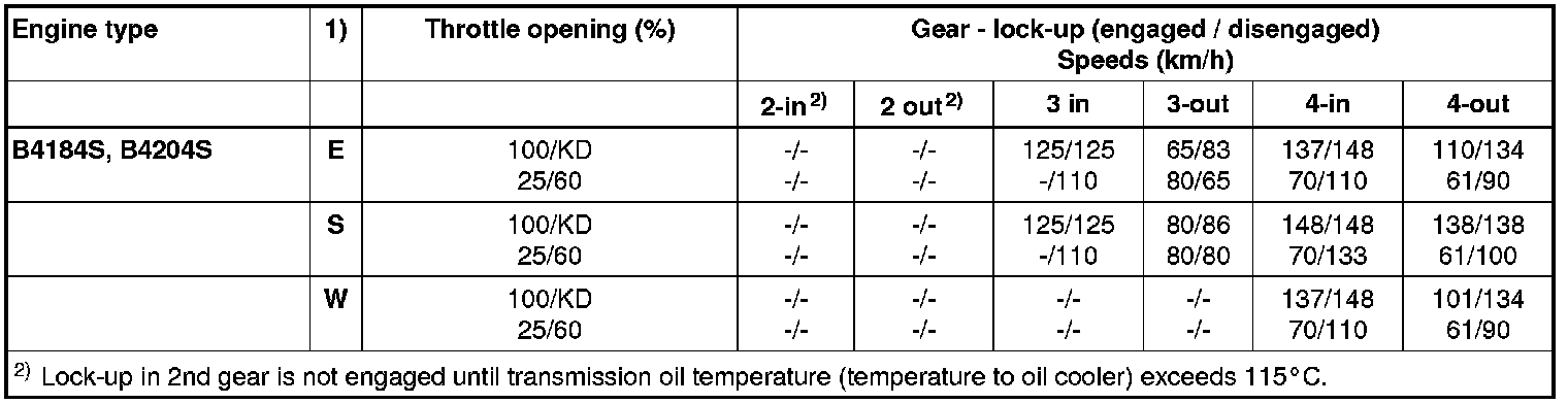 Mechanical lock-up of the torque converter occurs at various speeds depending on the driving mode (Economy (E), Sport (S), Winter (W) and gear position (D, 3, L) selected. Other factors, in addition to road speed, are transmission temperature and engine load (throttle opening). Lock-up is engaged at +20° C- 30° C oil temperature. Mechanical lock-up is also engaged in 2nd, 3rd and 4th gears.