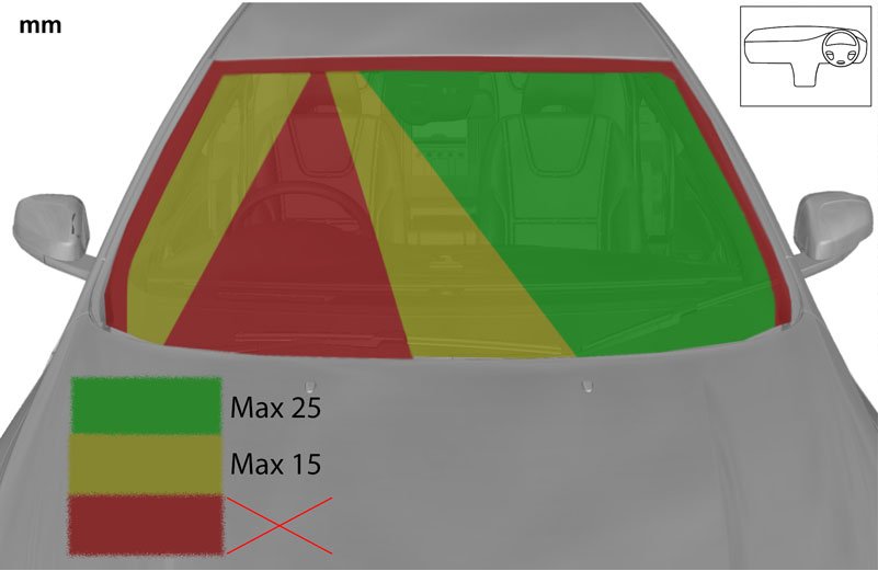 Minimum distance between damaged areas in the pane of glass is 100 mm.