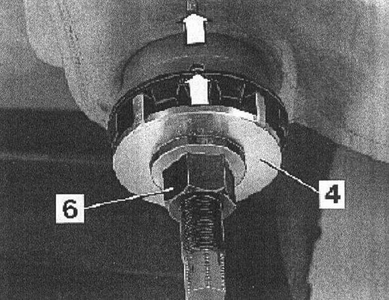 Apply the drift (4) with the spikes upwards and the bushing with the rubber spikes downwards on the screw with the nut (6).