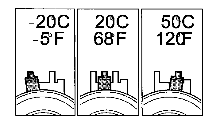 The illustration shows the position of the indicator when aligning the timing belt tensioner at different temperatures.