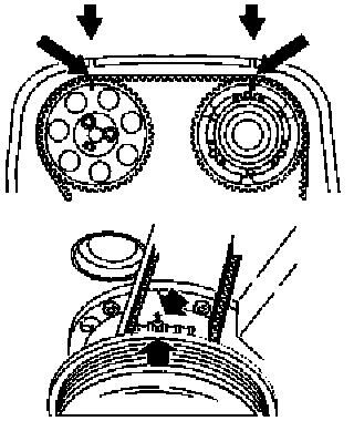 Install the timing gear pulley on the intake camshaft with two screws, but do not tighten. Adjust the timing gear pulleys so that the markings on the timing gear pulleys / upper timing cover correspond.