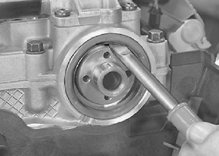 Tighten the center screw on the timing belt tensioner to5 Nm.