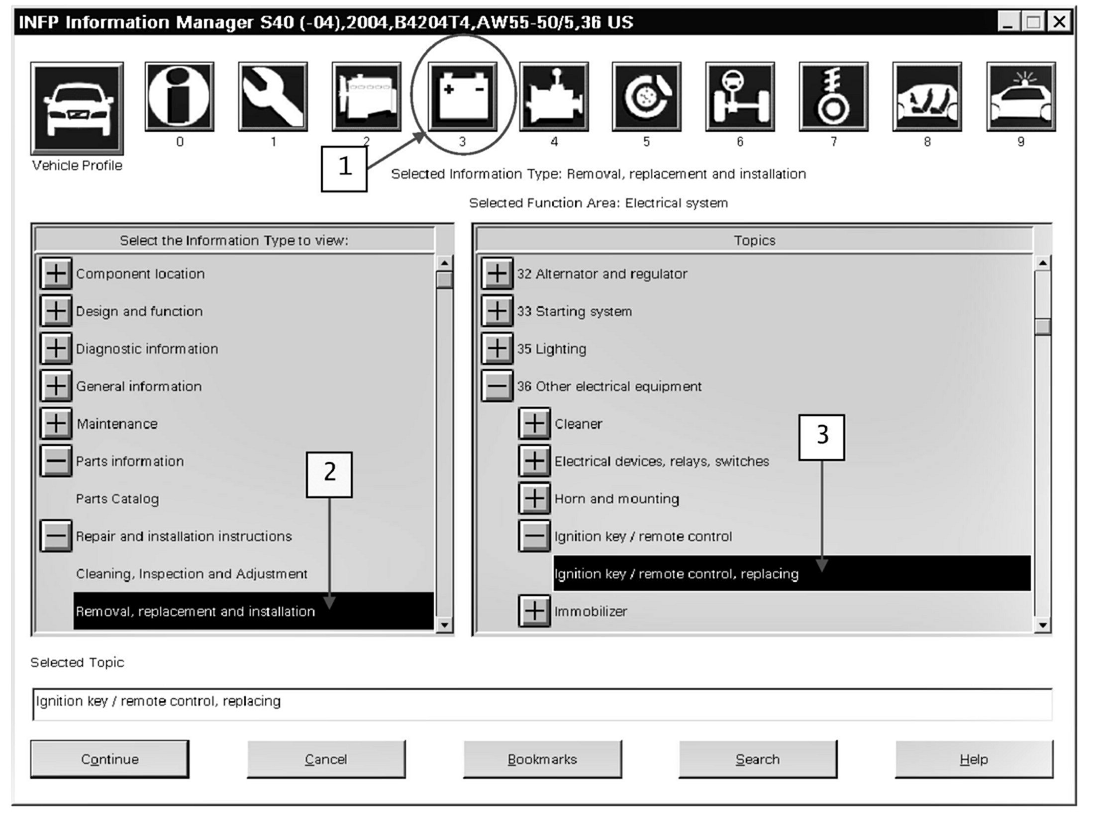 3. Select: 36 Other electrical equipment --> Ignition key/remote control --> Ignition key/remote control, replacing