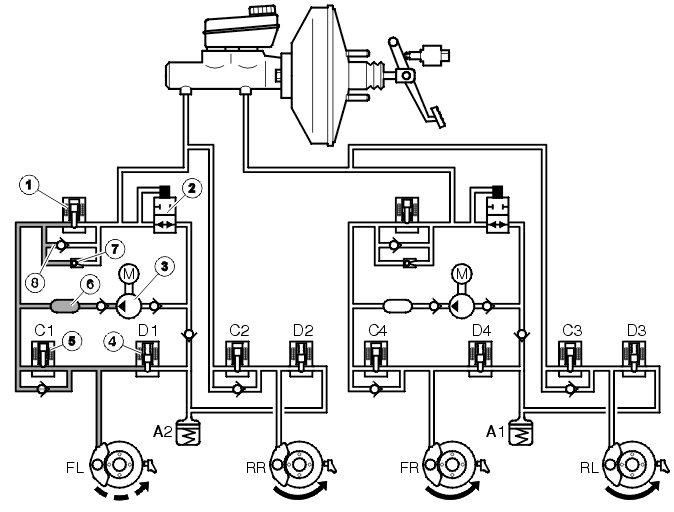 If the wheel locks anyway, the outlet valve opens and the brake fluid is allowed back to the accumulators resulting in a reduction in the brake circuit pressure (pressure release, see the left front wheel - FL). This reduces the hydraulic pressure and braking effect, allowing the wheel to accelerate. The hydraulic pump returns the brake fluid from the accumulators to the master cylinder.