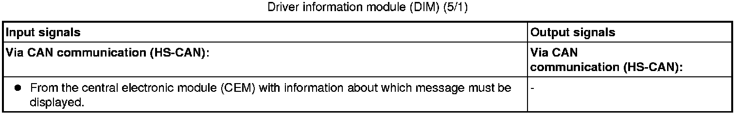 The tables below summarize the input and output signals to the units in the system for the immobilizer. The signal types are divided into directly connected signals, serial communication and controller area network (CAN) communication.