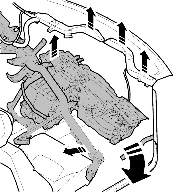 Hold up the member and cable duct on the passenger side. Remove the climate control unit on the passenger side.