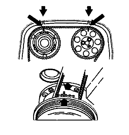 NOTE: The upper timing cover must be in place to view and align the alignment marks for the camshafts.