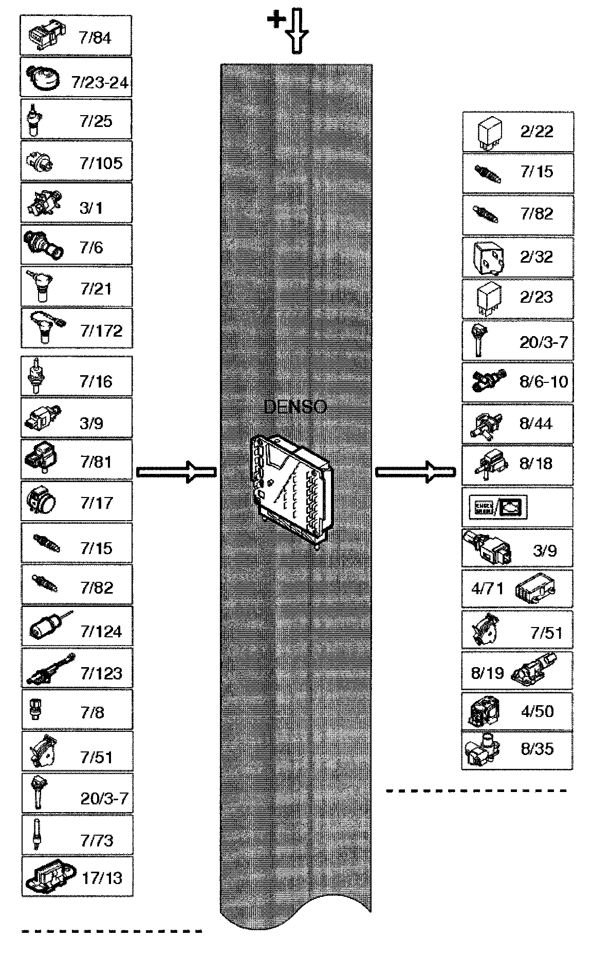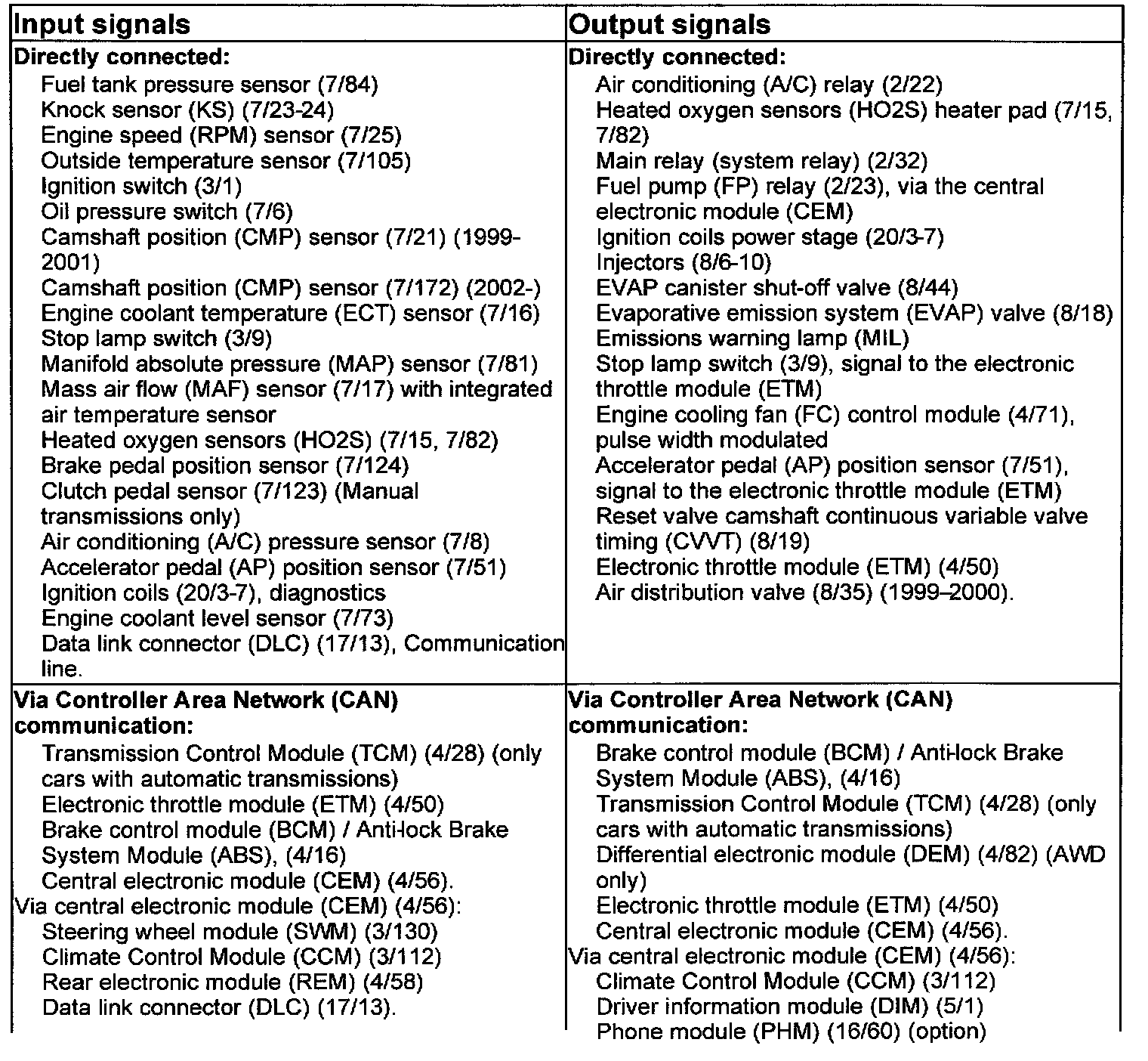 The table below summarizes the input signals to and output signals from the Engine Control Module (ECM). The signal types are divided into directly connected signals, serial communication and Controller area network (CAN) communication. The illustration below displays the same information with the Volvo component designations.
