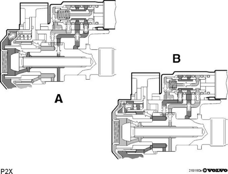 In the unemployed position the Continuous Variable Valve Timing valve is in the rear most position (A) because of the valve spring. In this position the piston connects the piston housing center and rear grooves with each other. At the same time the piston has exposed the front piston housing groove so that it is connected to the valve return terminal. Then the oil pressure is guided from the Continuous Variable Valve Timing valve center terminal to the valves rear terminal. From there the pressure is led through the camshaft bearing into the camshaft rear oil way, via the camshaft center channel to the Continuous Variable Valve Timing unit hub. The hub is connected to the Continuous Variable Valve Timing unit front chamber. The pressure in the Continuous Variable Valve Timing unit hub thereby presses onto the Continuous Variable Valve Timing unit piston and presses it backwards.