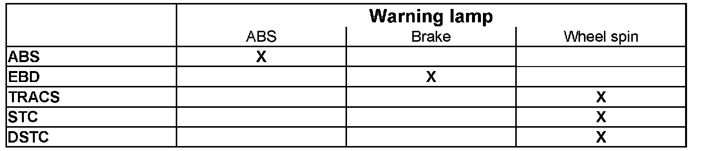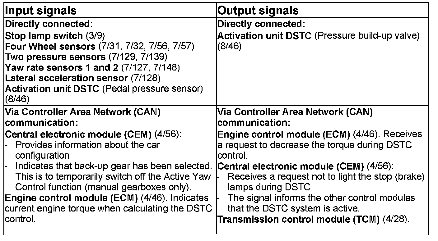 The control module checks calculations and all input and output signals via the built-in diagnostic functions. When the control module detects a fault certain functions are completely disengaged depending on the severity of the fault. At the same time a warning light comes on depending on the fault (see table). During manual disengagement of TRACS/STC/DSTC the control module stops all the functions except for the ABS, Electronic brake force distribution and vehicle speed signal. If the temperature of the brake discs is too high, certain functions are prevented from operating.