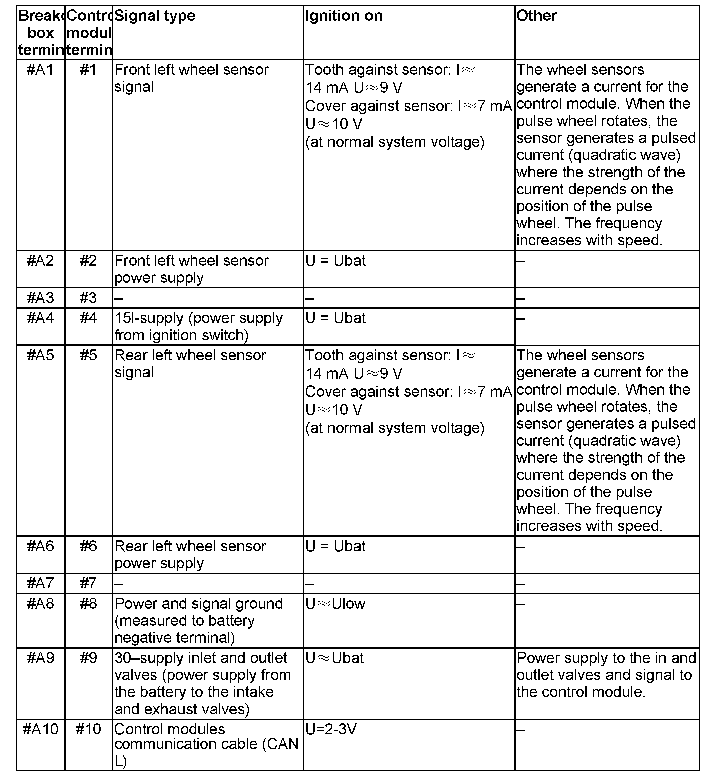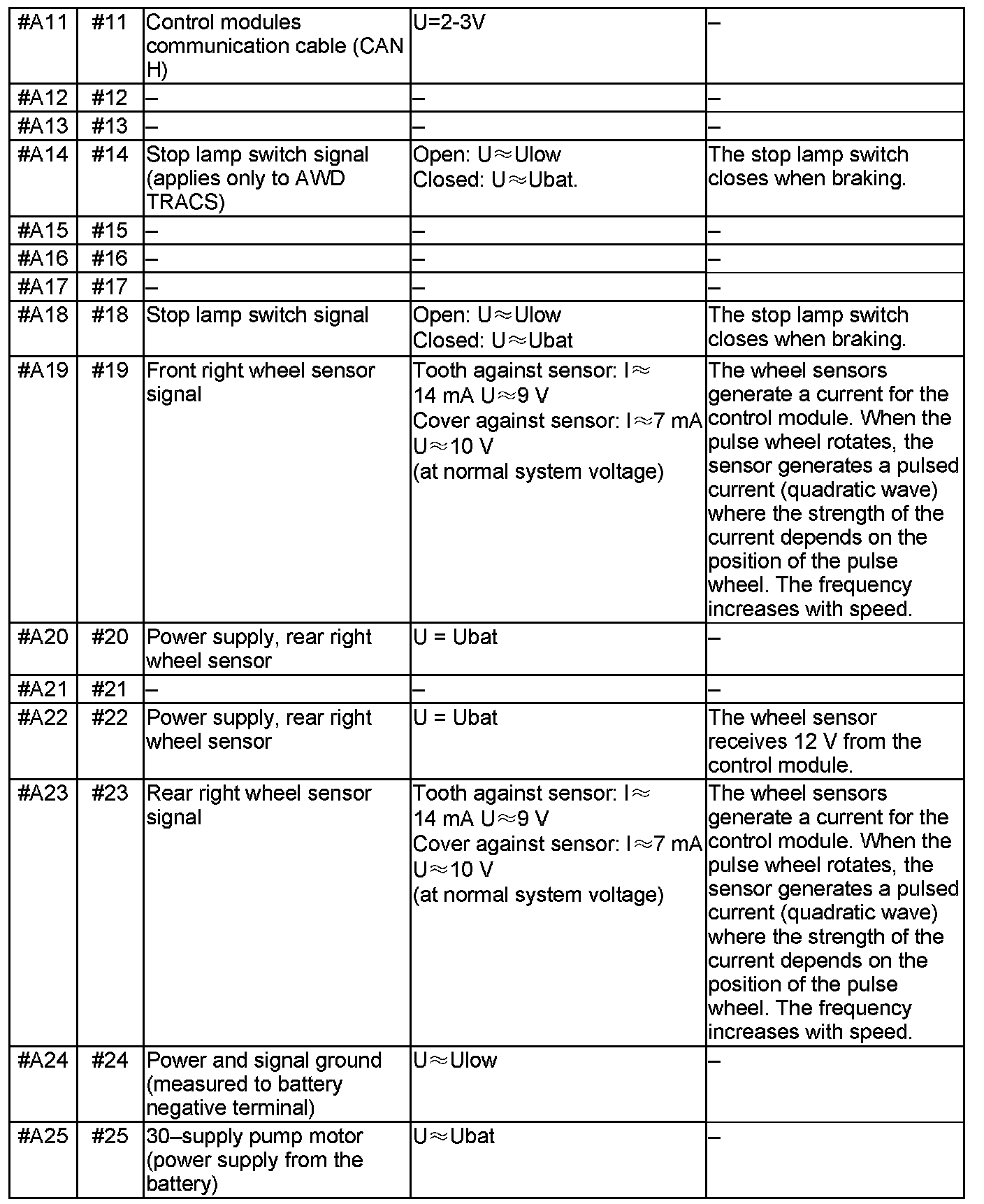 All values given are between the relevant terminal in column 1 and terminal #As or #A24 (ground), unless otherwise indicated in brackets.