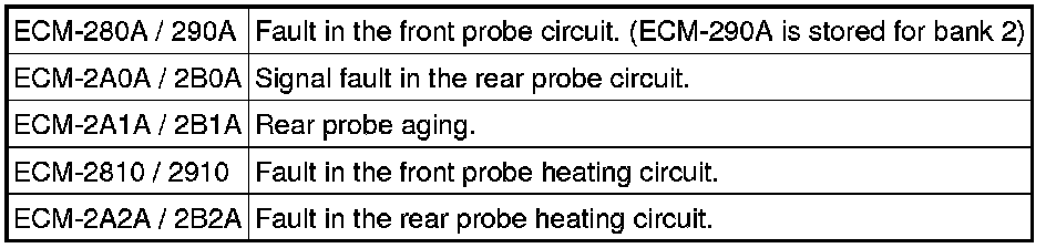 Probe monitoring begins after probe preheating diagnostics are complete. Diagnostic trouble code (DTC) ECM-280A/290A is stored if there is a fault in the front heated oxygen sensor (HO2S) or its wiring causing the signal to deviate from its permitted range.
