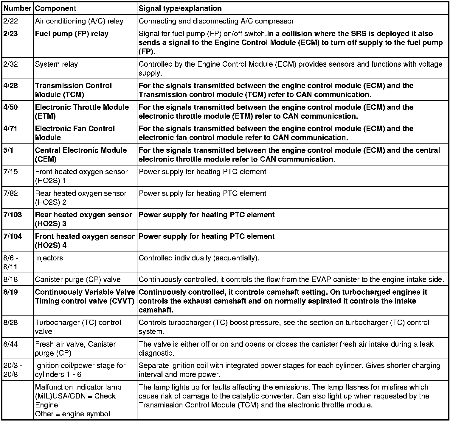 Sensors and functions which are different to previous types are marked in