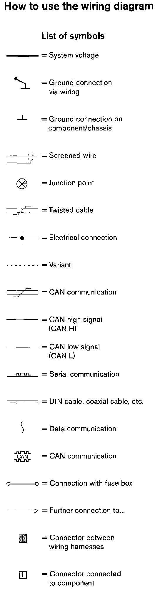 Today's cars are equipped with a CAN network, which transmits information. Connections to this network are shown in their entirety on the respective wiring diagrams. Complete information on CAN communication can be found in "Data communication". Diagrams