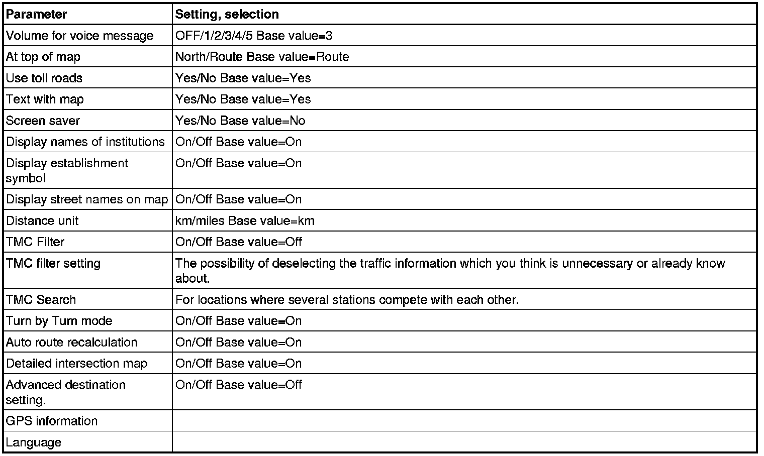 The following system settings in the road traffic information (RTI) control module can regain the base values if the road traffic information (RTI) control module power supply fails, when the road traffic information (RTI) control module or the battery are disconnected over a longer period of time for example. The Road Traffic Information (RTI) control module is always supplied with base values. After the road traffic information (RTI) control module is connected, or the power supply returned, the road traffic information (RTI) control module settings should be adjusted to the previous market and customer settings.