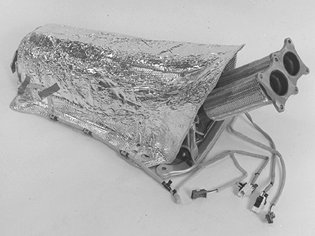 Pull back and lower the catalytic converters with their heat deflector plates.