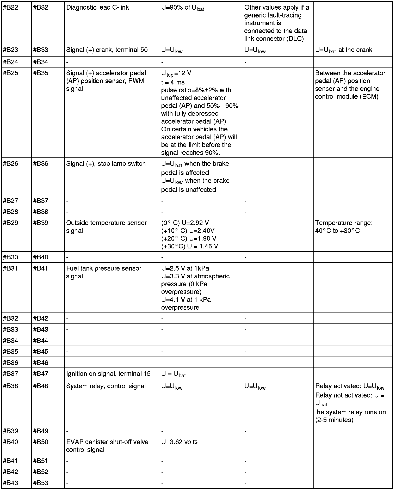 All the values given below are between the respective terminal in column 1 and terminal #B3 in column 2 (power ground) unless otherwise stated in brackets after the table entry. Control module terminals #A1-#A60 correspond to terminals #A1-#60 on the breakout box, terminals #A61-#A70 correspond to terminals #B1-#B10 on the breakout box and terminals #B1-#B50 correspond to terminals #B10-#B60 on the breakout box.