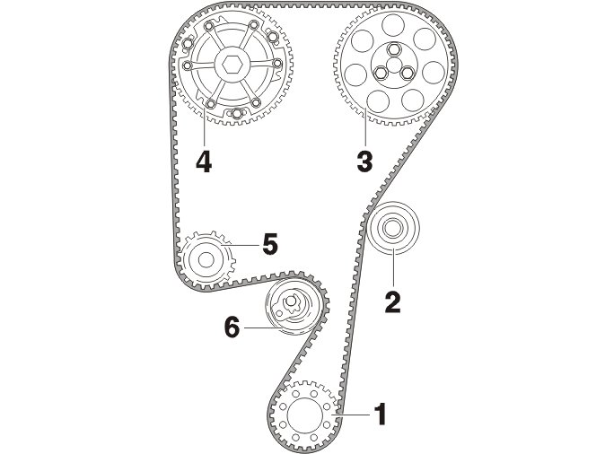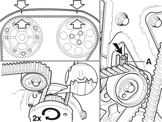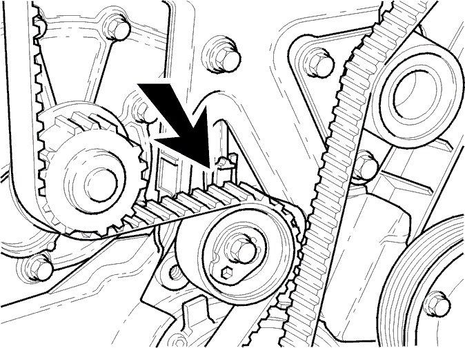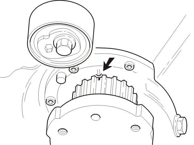 - Turn the crankshaft two turns. Check that the markings on the crankshaft and camshaft pulley correspond.