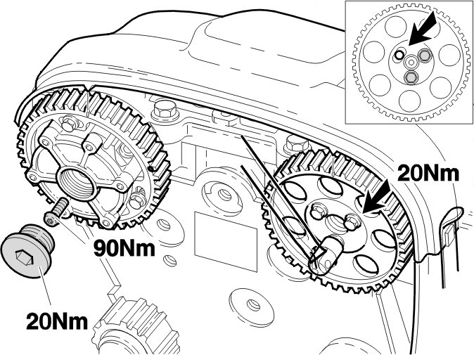 Tighten the center screw on the timing belt tensioner with variable valve timing. Tighten to 90 Nm.