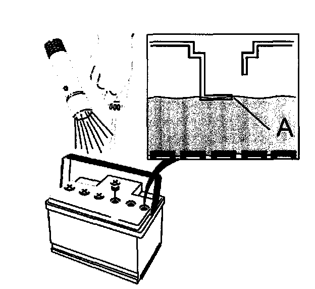 - Check the level in all the battery cells. Each cell has its own maximum mark (A). It is recommended that a flashlight is used
