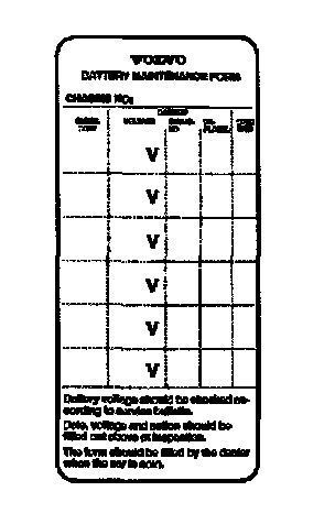A maintenance scheme for batteries will be supplied with new cars from the factory. There is a decal on the inside of the windshield. This decal indicates when the battery was checked and approved at the factory. The decal also gives the months when the battery should be checked and the maintenance schedule filled in. Everyone who is responsible for the car during transport and storage, before it is sold to the customer, is responsible for filling in the maintenance schedule.