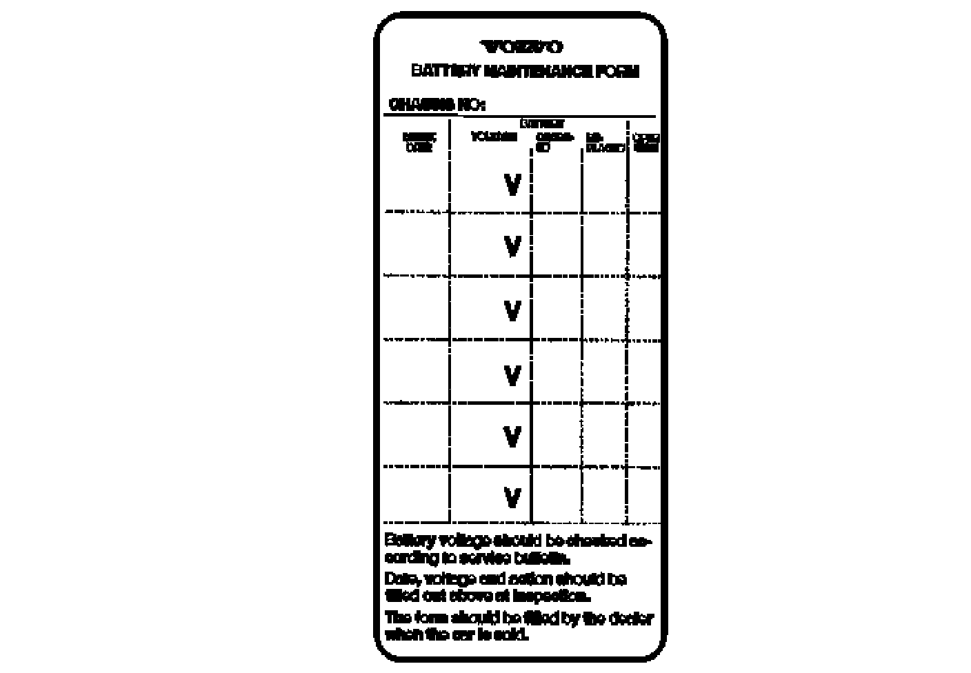 The battery must be checked before the end of the month listed. It must also be checked a final time a few days before delivery to the customer. The decal must be removed when the car is delivered. The maintenance schedule must be filed with the dealership for the duration of the car warranty. Check that the chassis number of the car is included on the maintenance schedule before removing it from the car for filing.