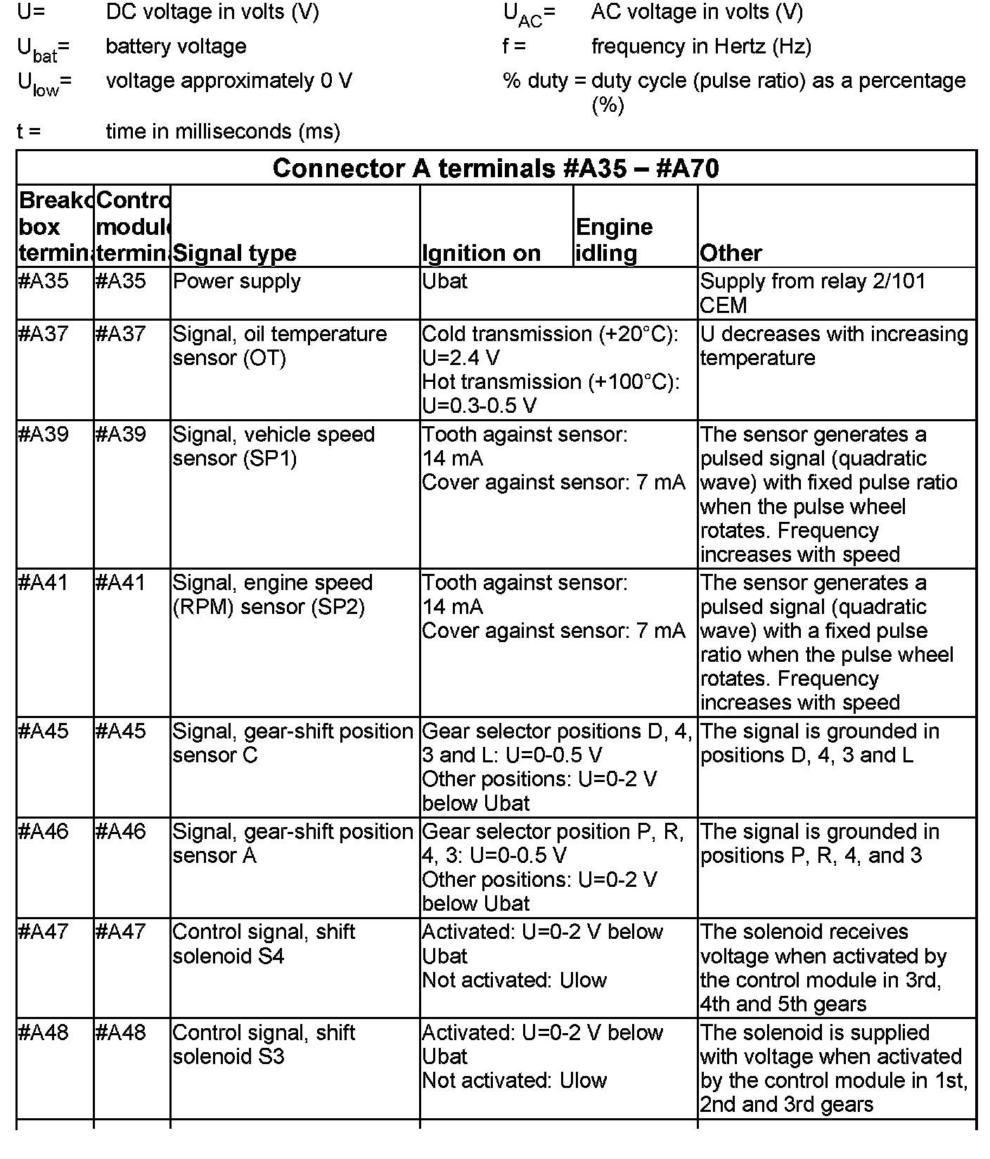All the values contained below are between the terminal in column 1 and terminal #A53 (signal ground), unless otherwise indicated in brackets.