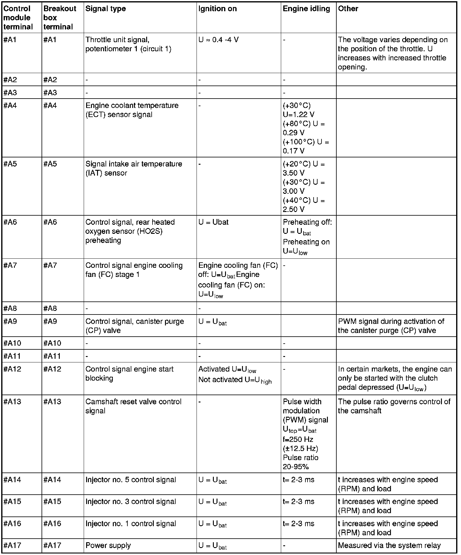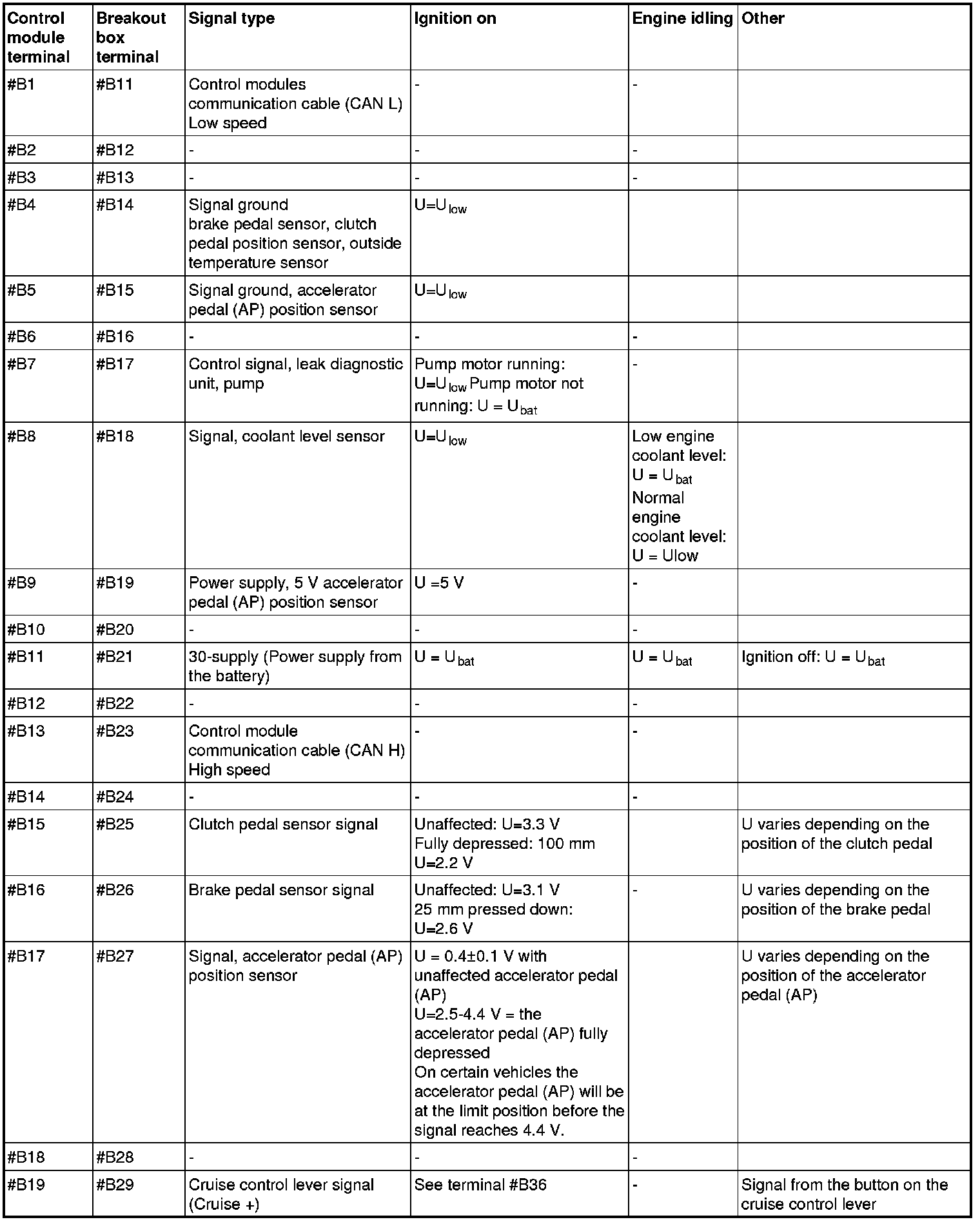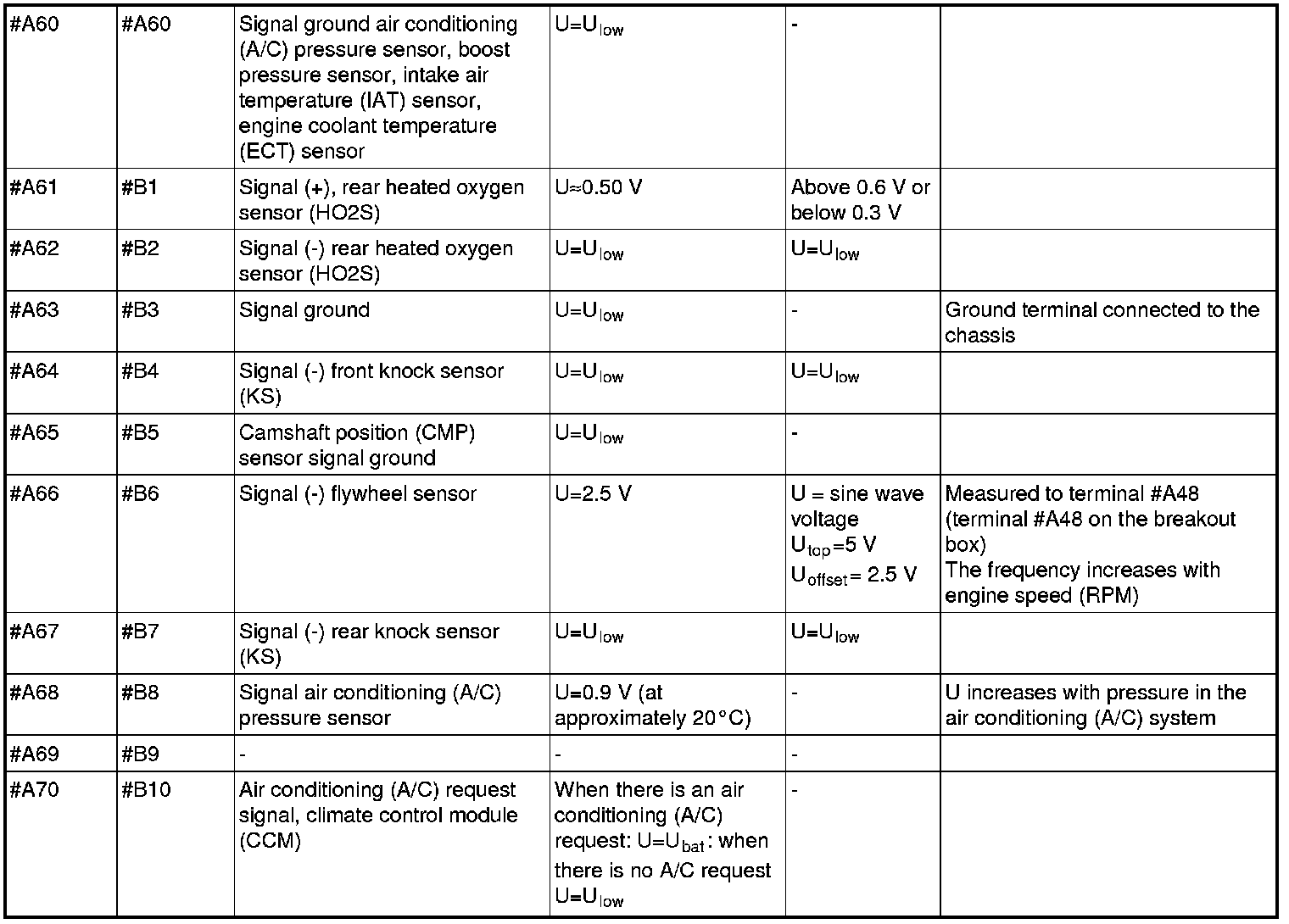 All values listed below should be measured between the respective terminal in column 1 (control module terminal) and terminal #B3 unless stated otherwise in column 6 (Other). Control module terminals #A1-#A70 correspond to terminals #A1-#B10 on the breakout box, terminals #B1-#B50 correspond to #B11 - #B60 on the breakout box.