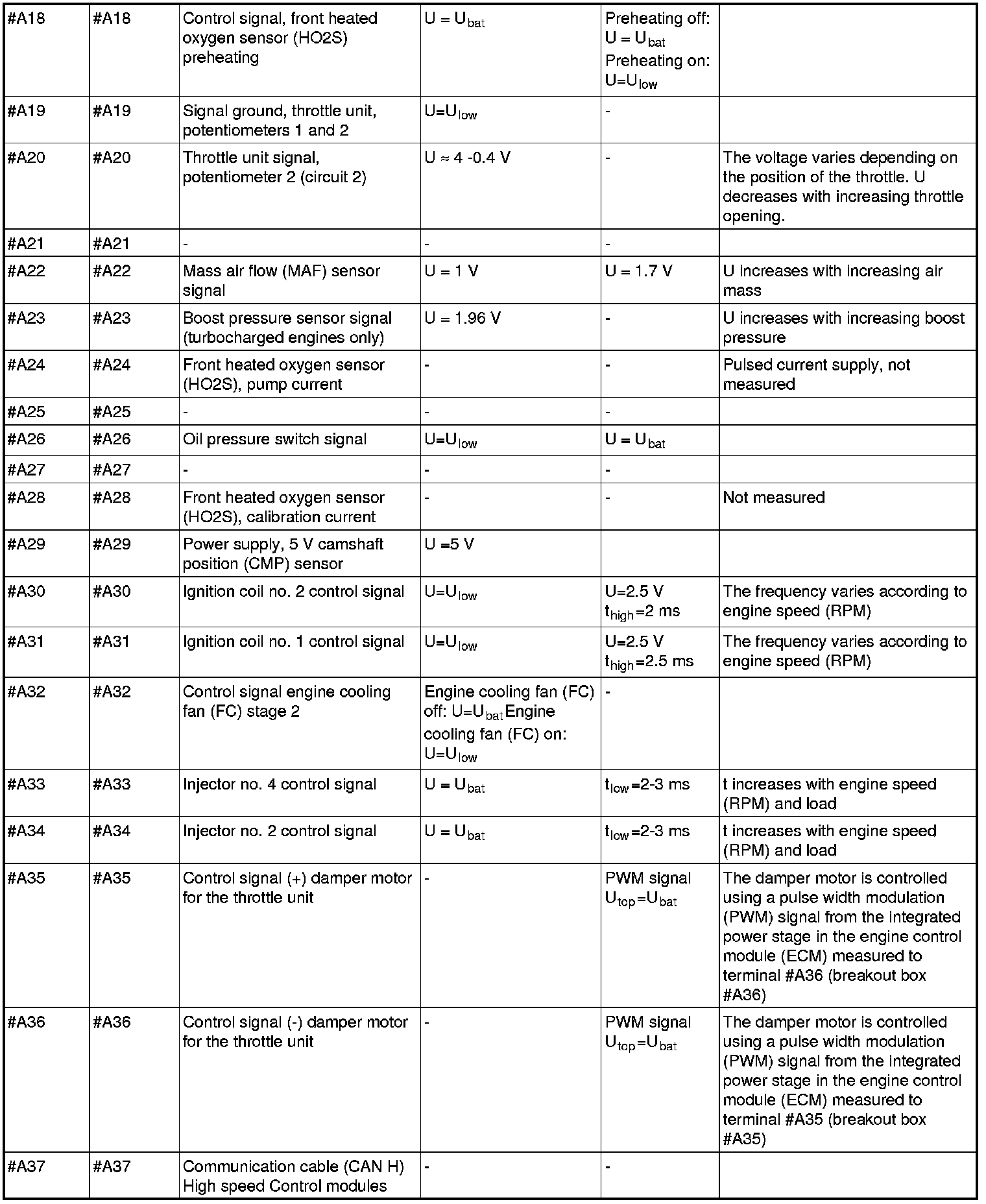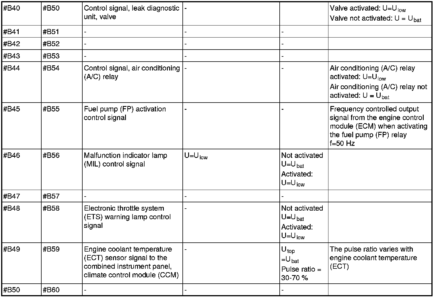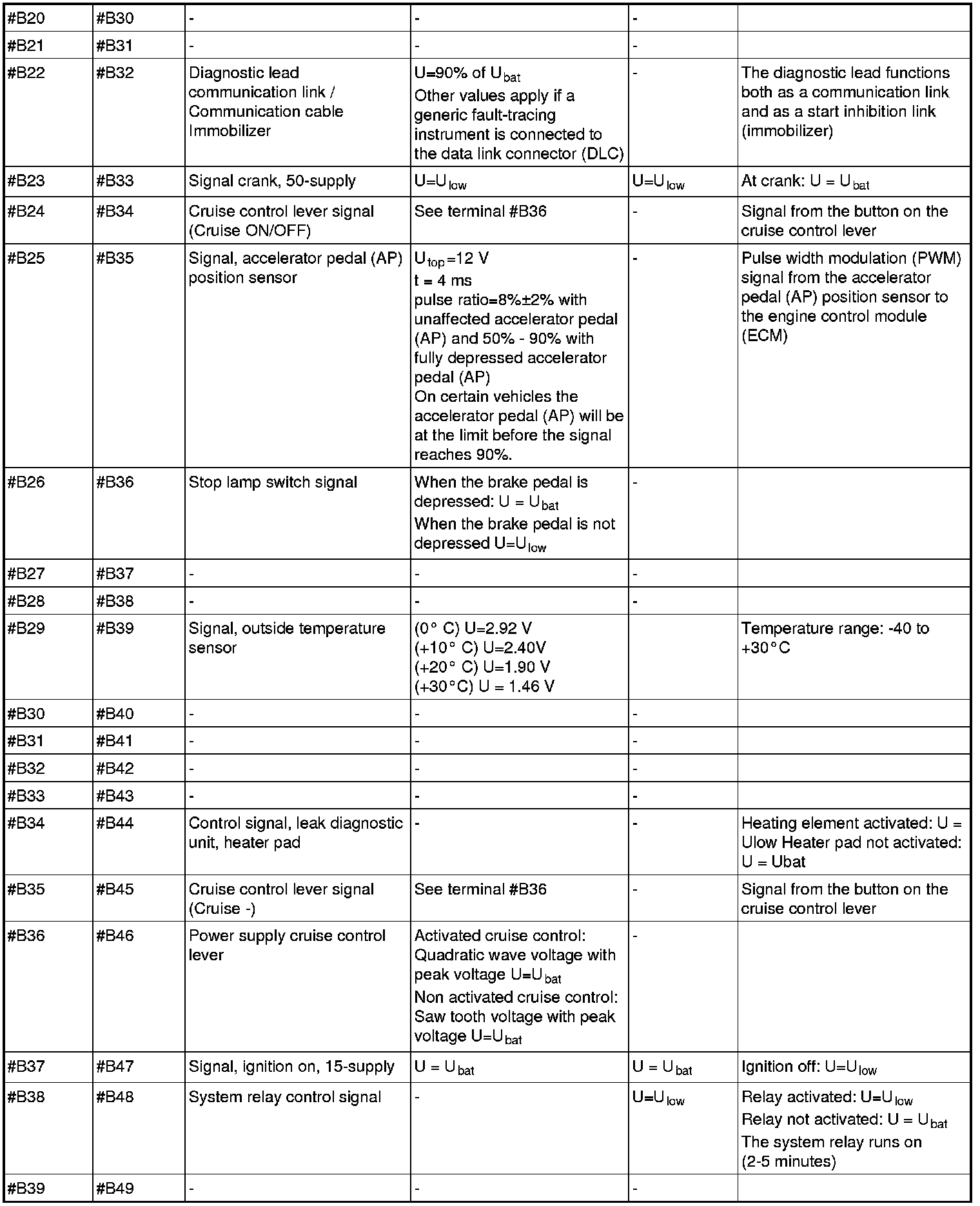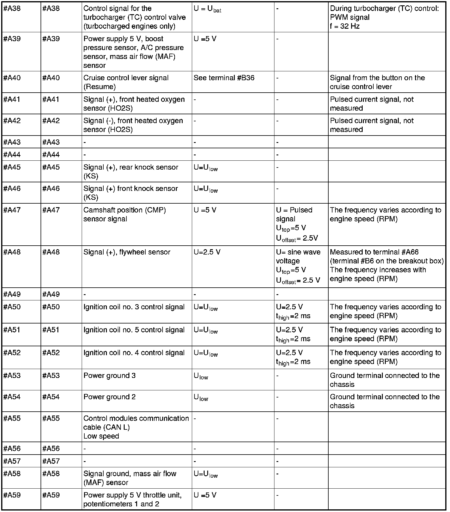 All values listed below should be measured between the respective terminal in column 1 (control module terminal) and terminal #B3 unless stated otherwise in column 6 (Other). Control module terminals #A1-#A70 correspond to terminals #A1-#B10 on the breakout box, terminals #B1-#B50 correspond to #B11 - #B60 on the breakout box.