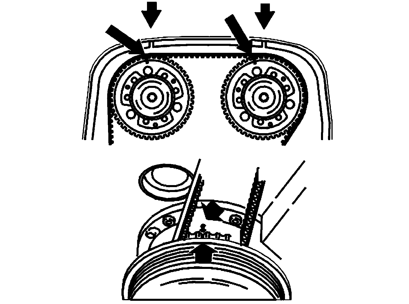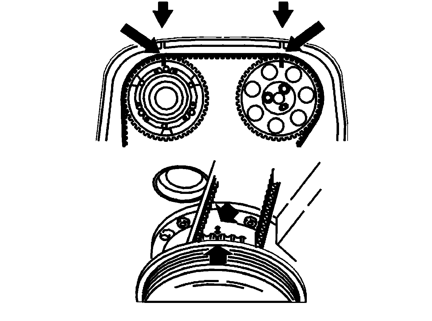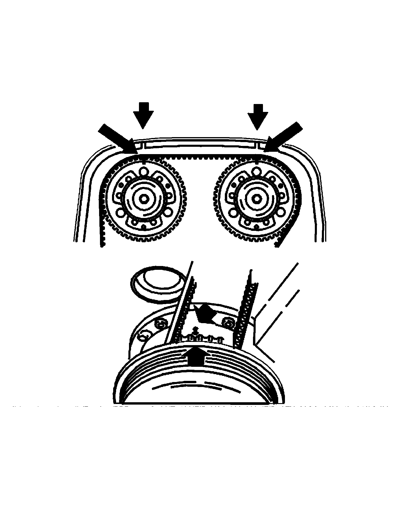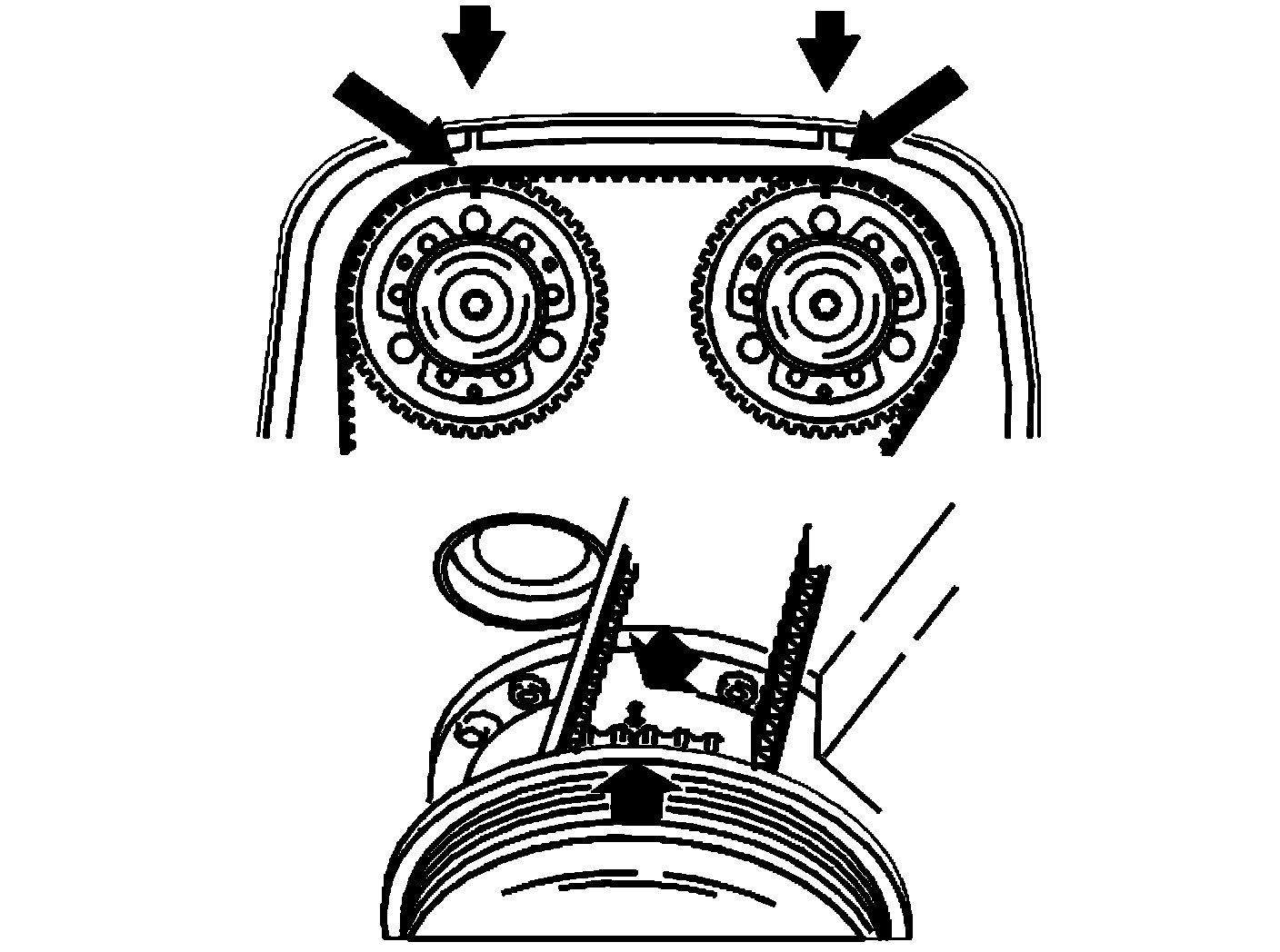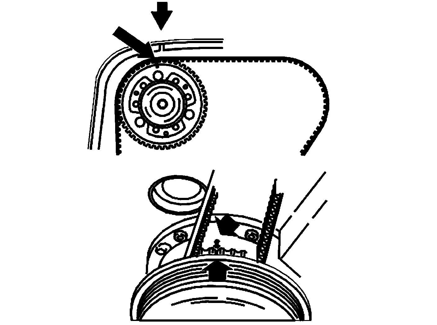 - Turn the timing gear pulley clockwise until the screws at the oval holes are in the limit position. Continue turning clockwise until the timing gear pulley marking is 2 cogs before the marking on the upper timing cover.