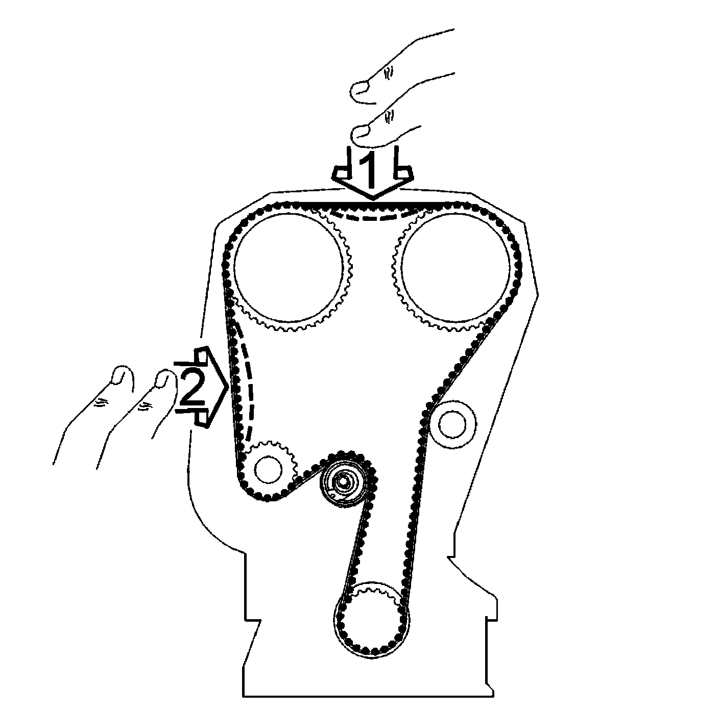 - Press the toothed belt to check that the indicator on the tensioner moves easily.