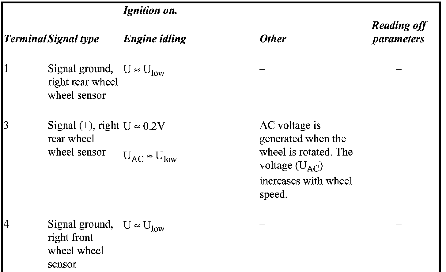 All the values given below are between the terminal stated in column 1 and terminal 16 (ground). This applies unless otherwise indicated in brackets. ABS control module terminals 1-40 correspond to terminals 1-40 on the breakout box.