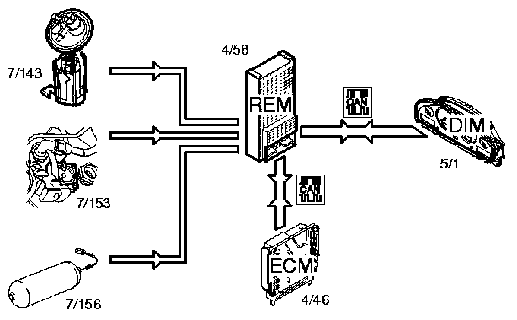 - The rear electronic module (REM) calculates the quantity of fuel remaining in each tank and transmits this information via the Control area network (CAN) to the driver information module (5/1). The driver information module (DIM) also receives data via the Control area network (CAN) from the engine control module (ECM) (4/46) indicating which type of fuel the car is running on. The gas level in the tank is displayed via the fuel gauge. The gasoline fuel level is displayed in the text window in the driver information module (DIM).