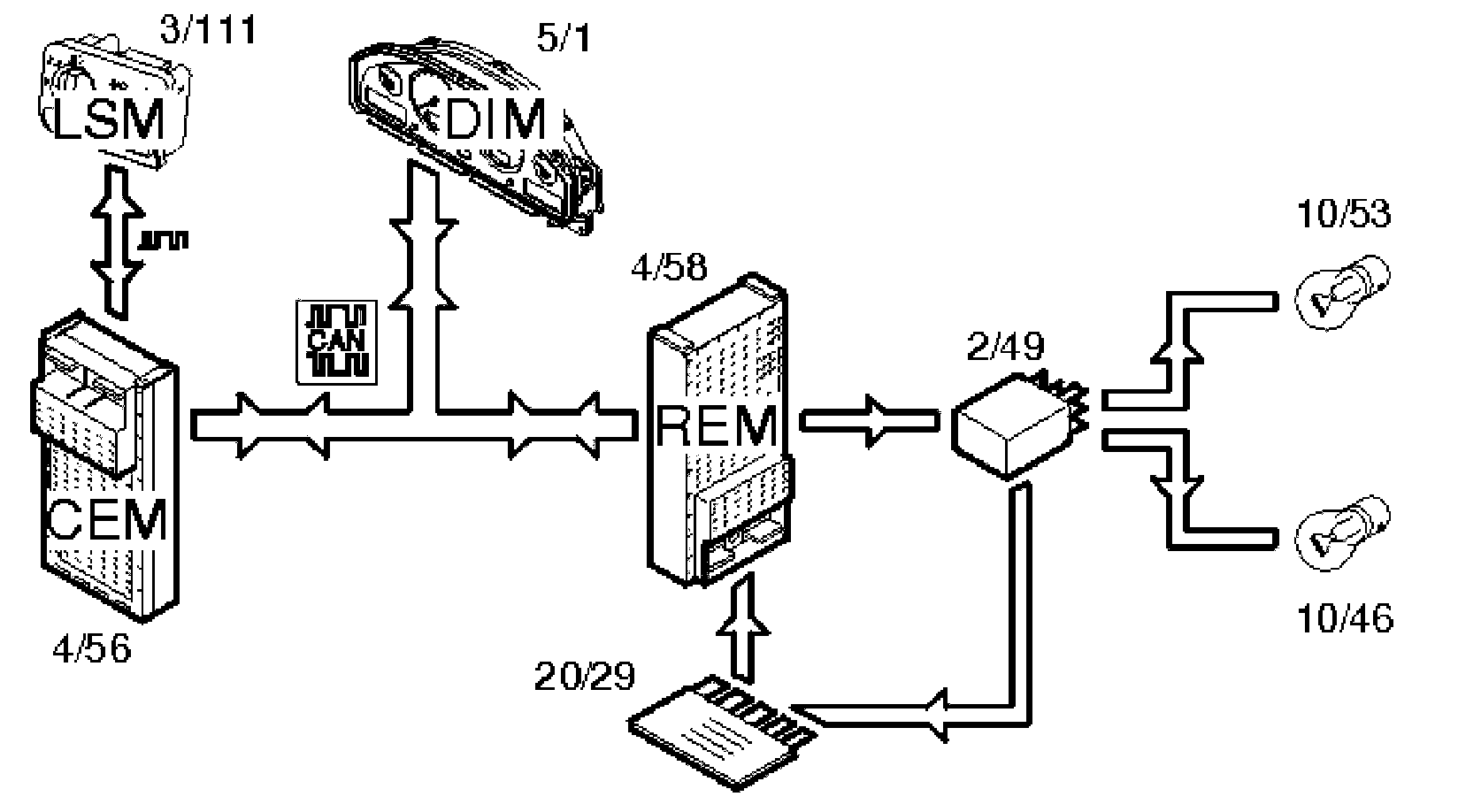 The rear fog lamps (10/46, 10/53) are activated by pressing the button for the rear fog lamps in the lamp switch module (3/111). The light switch module (LSM) transmits a request to light the lamps to the central electronic module (CEM) (4/56) using serial communication. The central electronic module (CEM) transmits the request to the rear electronic module (REM) (4/58) via the Controller area network (CAN). The rear electronic module (REM) activates the relay (2/49) and the lamps are supplied with power via the relay.