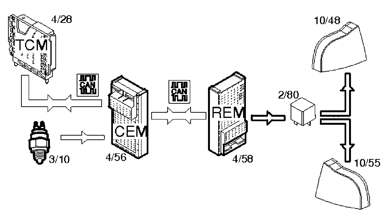 The back-up (reversing) lamps (10/48, 10/55) are activated when back-up (reverse) gear is selected. The transmission control module (TCM) (4/28) transmits information via the Control area network (CAN) to the central electronic module (CEM) (4/56) indicating that back-up (reverse) gear is selected. The central electronic module (CEM) transmits the information via the Controller area network (CAN) to the rear electronic module (REM) (4/58) to activate the back-up (reversing) lamps. The rear electronic module (REM) activates the relay (2/80) and the lamps are supplied with power via the relay.