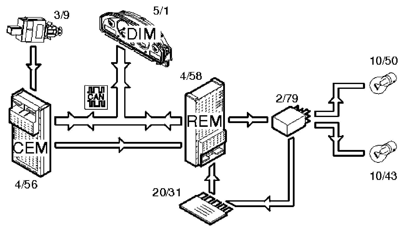 Information about the lamp circuit is obtained by the rear electronic module (REM) via a shunt (20/29). The rear electronic module (REM) sends the status of the lamp fault via the Control area network (CAN) to the central electronic module (CEM). In the event of a fault, the central electronic module (CEM) transmits data via the Control area network (CAN) to the driver information module (DIM) which displays a text message.