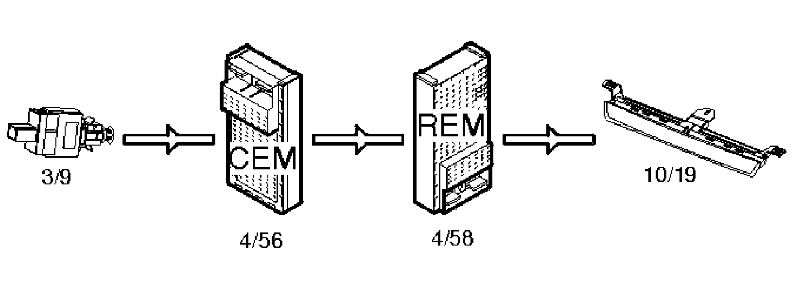 - When a power consuming component is connected to the rear 12V socket (17/19), the power consumption is measured via a directly connected shunt (20/39) on the rear electronic module (REM) (4/58). The rear electronic module (REM) transmits status data via the control area network (CAN) to the driver information module (DIM) (5/1) which displays a text message (applies only to factory mounted 12V sockets).