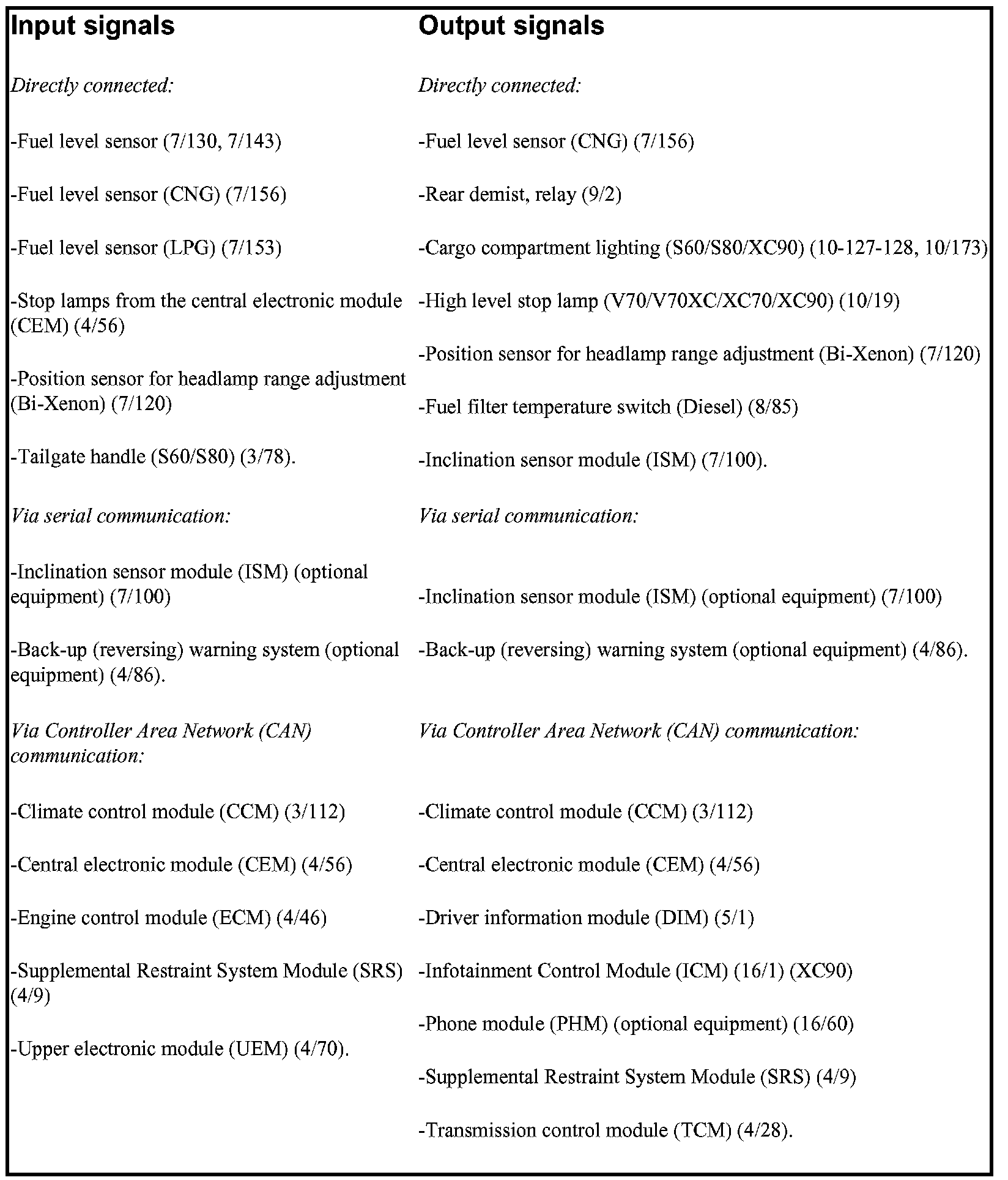 The following table summarizes input and output signals to and from the rear electronic module (REM). The signal types are divided into directly connected signals, serial communication and Controller area network (CAN) communication. The illustration below displays the same information with the Volvo component designations.