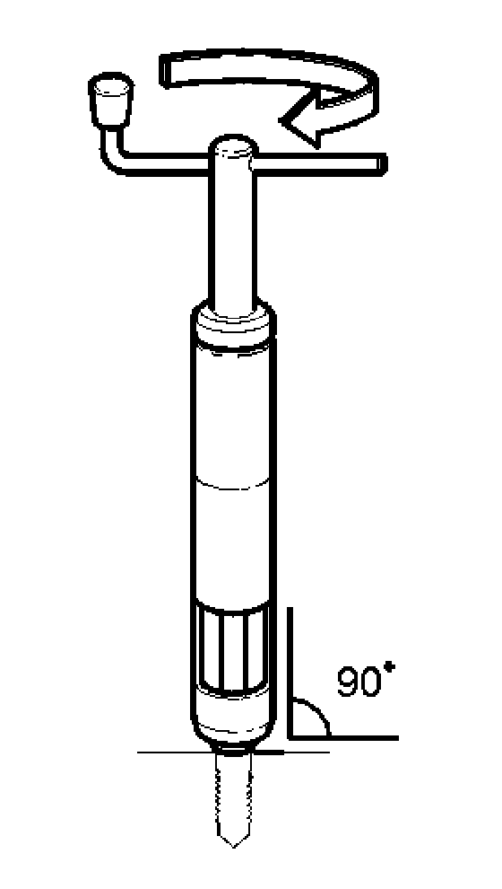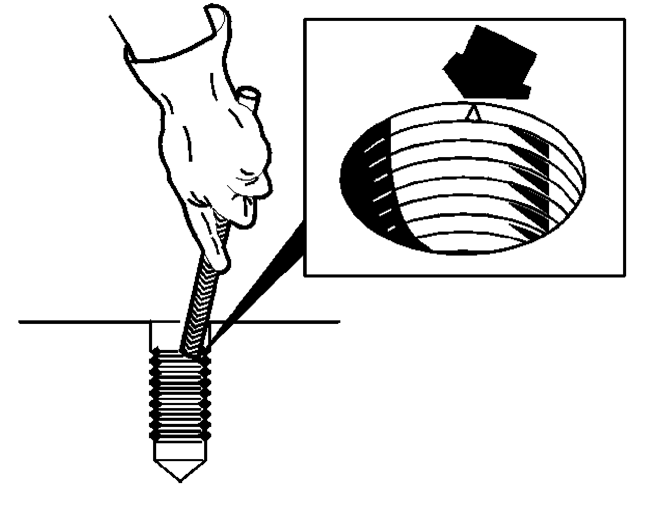 Hold the installation tool straight above and centered over the hole. Screw in the insert without applying pressure on the spindle handle. Screw in until the end of the insert reaches at least half a thread revolution into the thread.