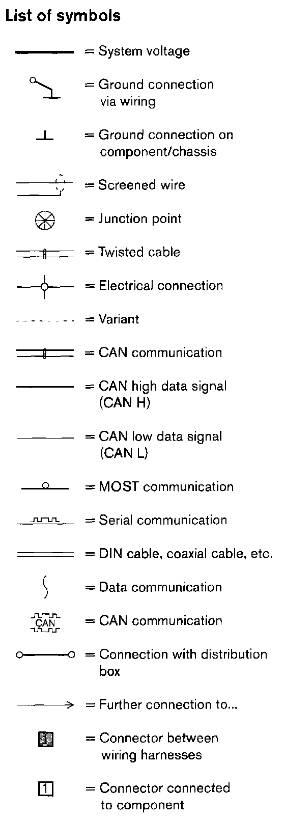 Today's cars are equipped with a CAN network, which transmits information. Connections to this network are shown in their entirety on the respective wiring diagrams. Complete information on CAN communication can be found in "Data communication". Diagrams