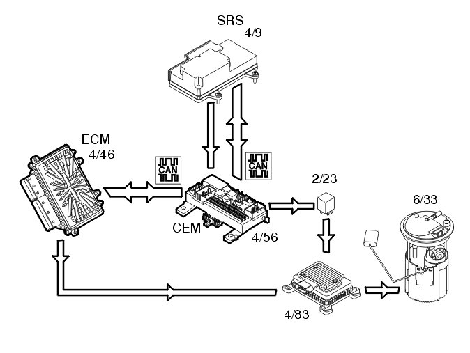 The central electronic module (CEM) (4/56) receives a request from the engine control module (ECM) (4/46) via the control area network (CAN) to start the fuel pump (FP). The central electronic module (CEM) then activates the relay (2/23) which supplies the fuel pump unit (4/83) with power, which in turn powers the fuel pump (FP) (6/33).